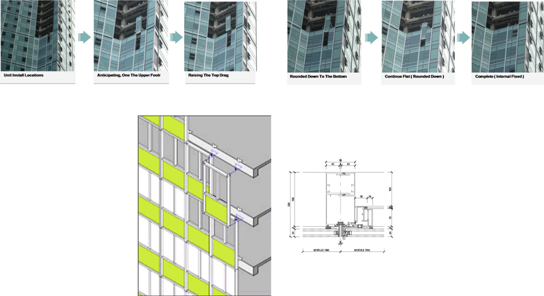 모든 조립이 공장에서 이루어지므로 품질이 좋고 고층건물에 적합한 장점을 가지고 있다.