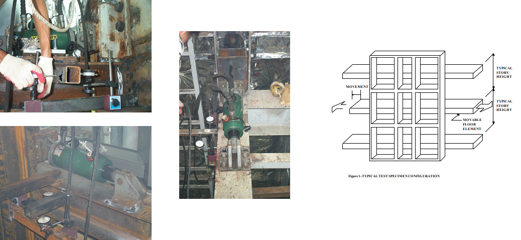 설치된 외벽이 지진에 의해 변위발생시 그 성능을 평가 위한 시험.
